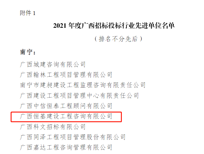 3月15日,廣西建筑業(yè)聯(lián)合會召開招標投標分會二屆四次會員代表大會,會上表彰了2021年度廣西招標投標行業(yè)先進單位以及2021年度廣西招標代理機構(gòu)先進個人。廣西恒基建設工程咨詢有限公司在眾多參評單位中脫穎而出,榮獲“2021年度廣西招標投標行業(yè)先進單位”;同時,公司石愛娟、周赤衛(wèi)、覃漢東、劉世健、陸秒、任坤、黃俊才、方興8人獲評“2021年度廣西招標代理機構(gòu)先進個人”稱號。