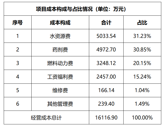 本項目經(jīng)營成本主要包括水資源費、藥劑費、燃料動力、工資福利費、修理費、其他管理費用。