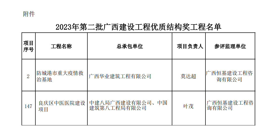 12月25日,廣西建筑業(yè)聯(lián)合會公布了2023年第二批廣西壯族自治區(qū)建設工程優(yōu)質(zhì)結構獎獲獎名單,由恒基咨詢監(jiān)理的《防城港市重大疫情救治基地》《良慶區(qū)中醫(yī)醫(yī)院建設項目》位列其中。