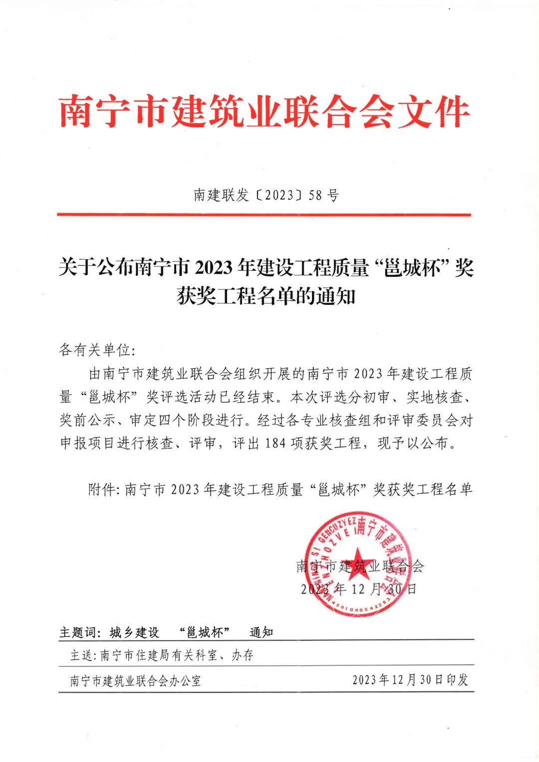 近日,南寧市建筑業(yè)聯(lián)合會公布了南寧市2023年建設(shè)工程質(zhì)量“邕城杯”獎獲獎工程名單。經(jīng)初審、實(shí)地核查、獎前公示、審定等4個階段,恒基咨詢監(jiān)理的“南寧市翠竹實(shí)驗(yàn)學(xué)校”等9個項(xiàng)目,成功斬獲該獎項(xiàng),充分展現(xiàn)了公司的服務(wù)質(zhì)量和綜合實(shí)力。