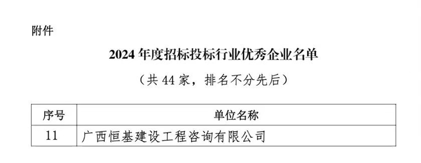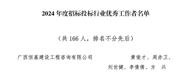 2025年9月22日,廣西建筑業(yè)聯(lián)合會(huì)公布了2024年度招標(biāo)投標(biāo)行業(yè)優(yōu)秀企業(yè)和優(yōu)秀工作者名單,廣西恒基建設(shè)工程咨詢有限公司憑借卓越的專業(yè)能力和優(yōu)質(zhì)的服務(wù),成功榮獲2024年度招標(biāo)投標(biāo)行業(yè)優(yōu)秀企業(yè)稱號(hào),多名員工同時(shí)榮獲招標(biāo)投標(biāo)行業(yè)優(yōu)秀工作者稱號(hào)。